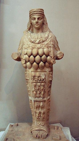 Preotesele și zeițele sunt cel mai des reprezentate cu sânii dezgoliți, deoarece reprezintă simboluri ale fertilității, purității și puterii divine. Sânul, la grecii antici, nu era văzut (doar) ca organ sexual, ci ca organ hrănitor și vital, reprezentând viața și maternitatea, așa cum vom vedea în continuare. Dar vreau să pornim de la o premisă clară: