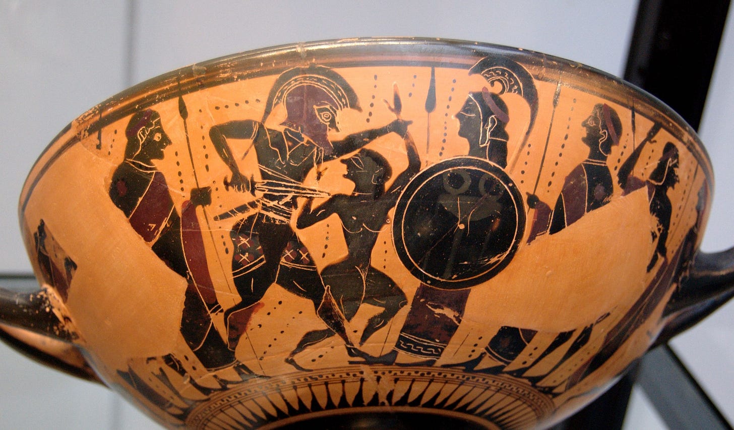 Conform Iliadei (dar nu numai!), Războiul Troian a fost pornit de Menelaus, regele Spartei, după ce soția lui, Elena, a fugit cu un prinț troian pe nume Paris3. Elena din Sparta, cunoscută mai apoi drept Elena din Troia, era fiica lui Zeus și a Ledei, pe care Zeus o “îmbrățișase” deghizat sub formă de lebădă. Astfel, Elena avea un statut semi-divin și era cunoscută drept cea mai frumoasă muritoare din lume.