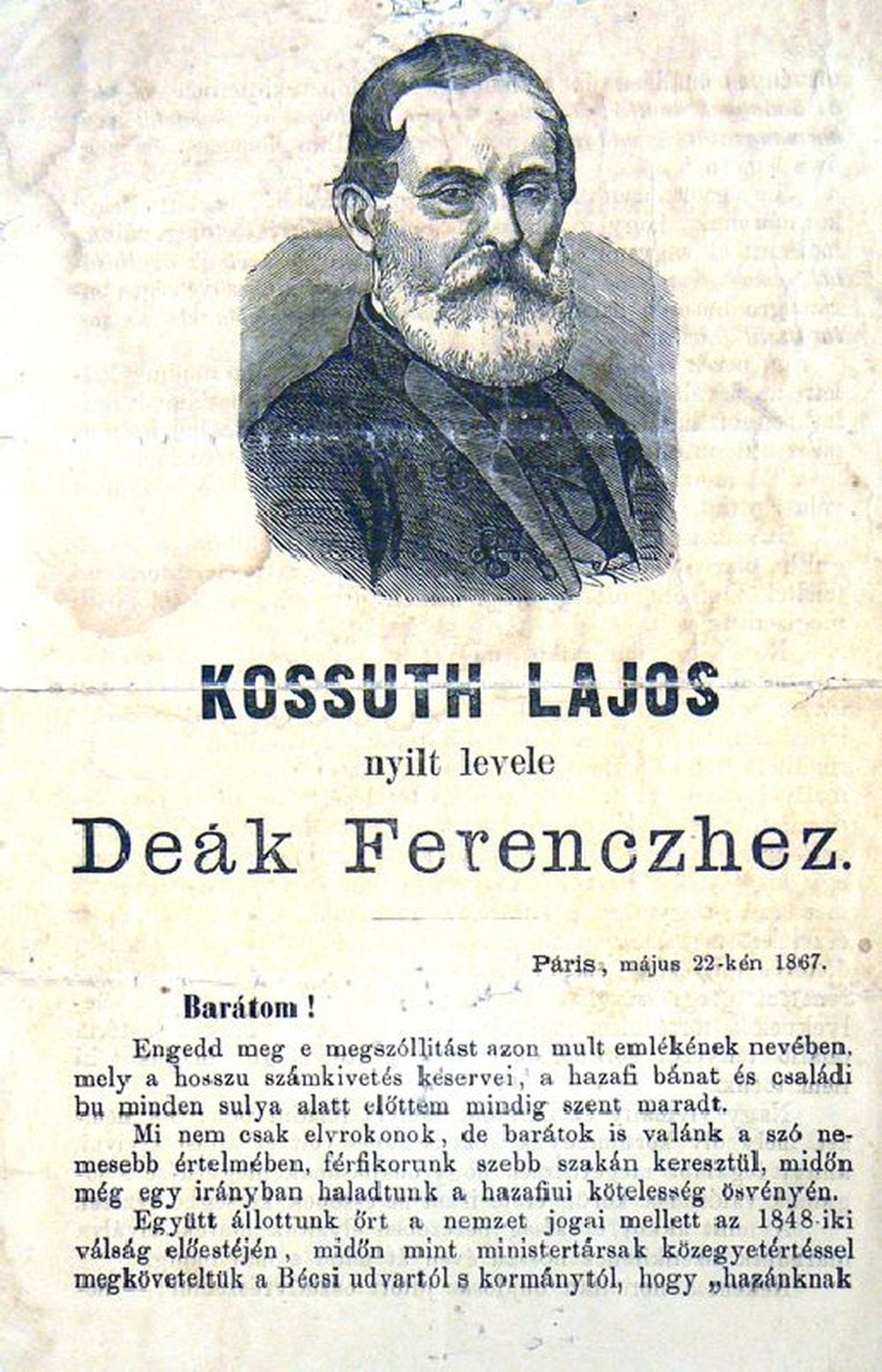 Unul dintre radicalii maghiari care s-au opus Compromisului a fost însuși liderul Revoluției de la 1848, Lajos Kossuth. Aflat în exil la Paris, Kossuth redactează o scrisoare deschisă către Ferenc Deák și o trimite spre publicare în presa maghiară. Redactată în 22 mai, ea apare în Magyar Újság pe 26 mai, iar în Magyarország pe 28 mai 1867, cu doar o zi înaintea ratificării Compromisului. Conținutul scrisorii este tulburător prin natura sa profetică.